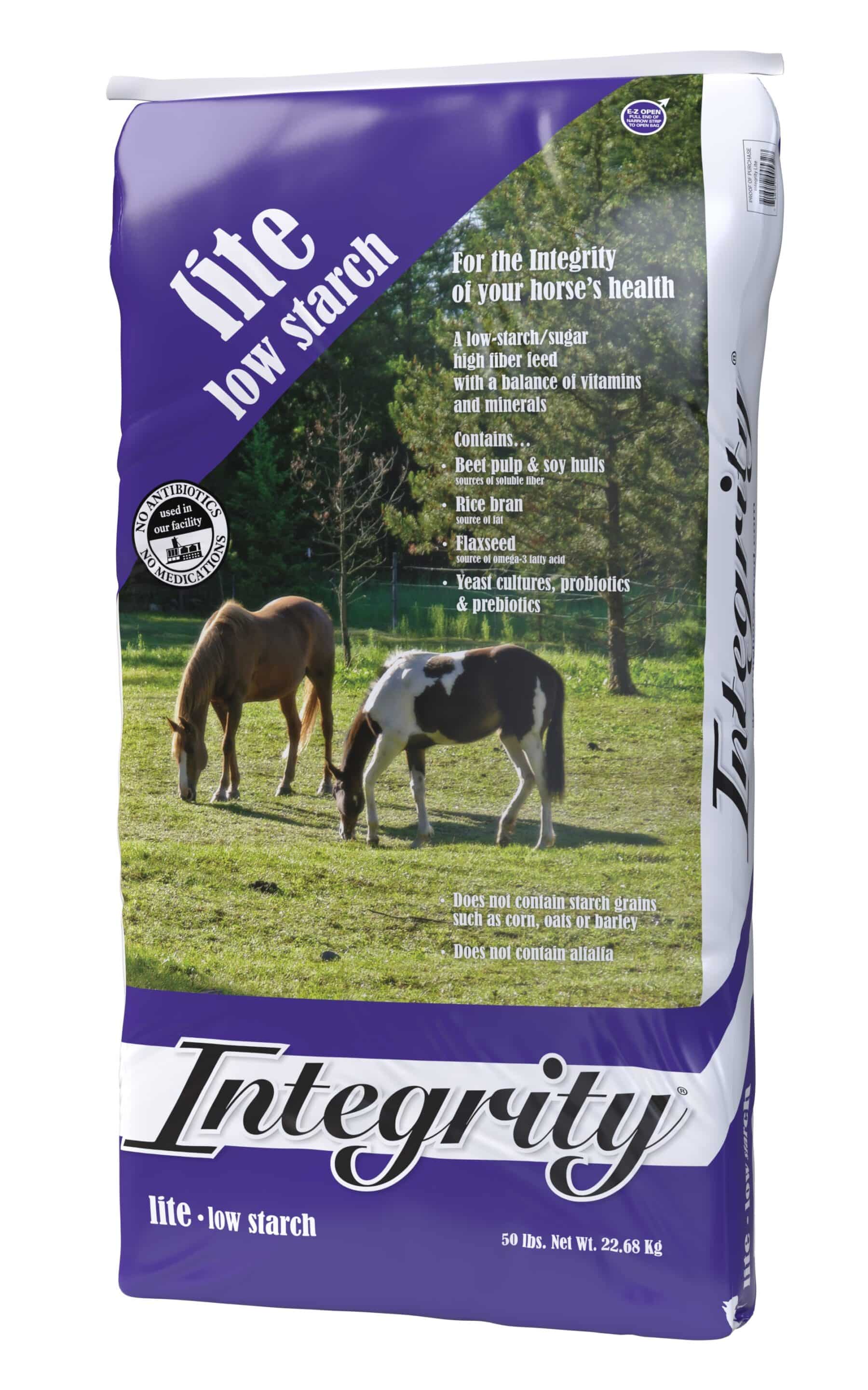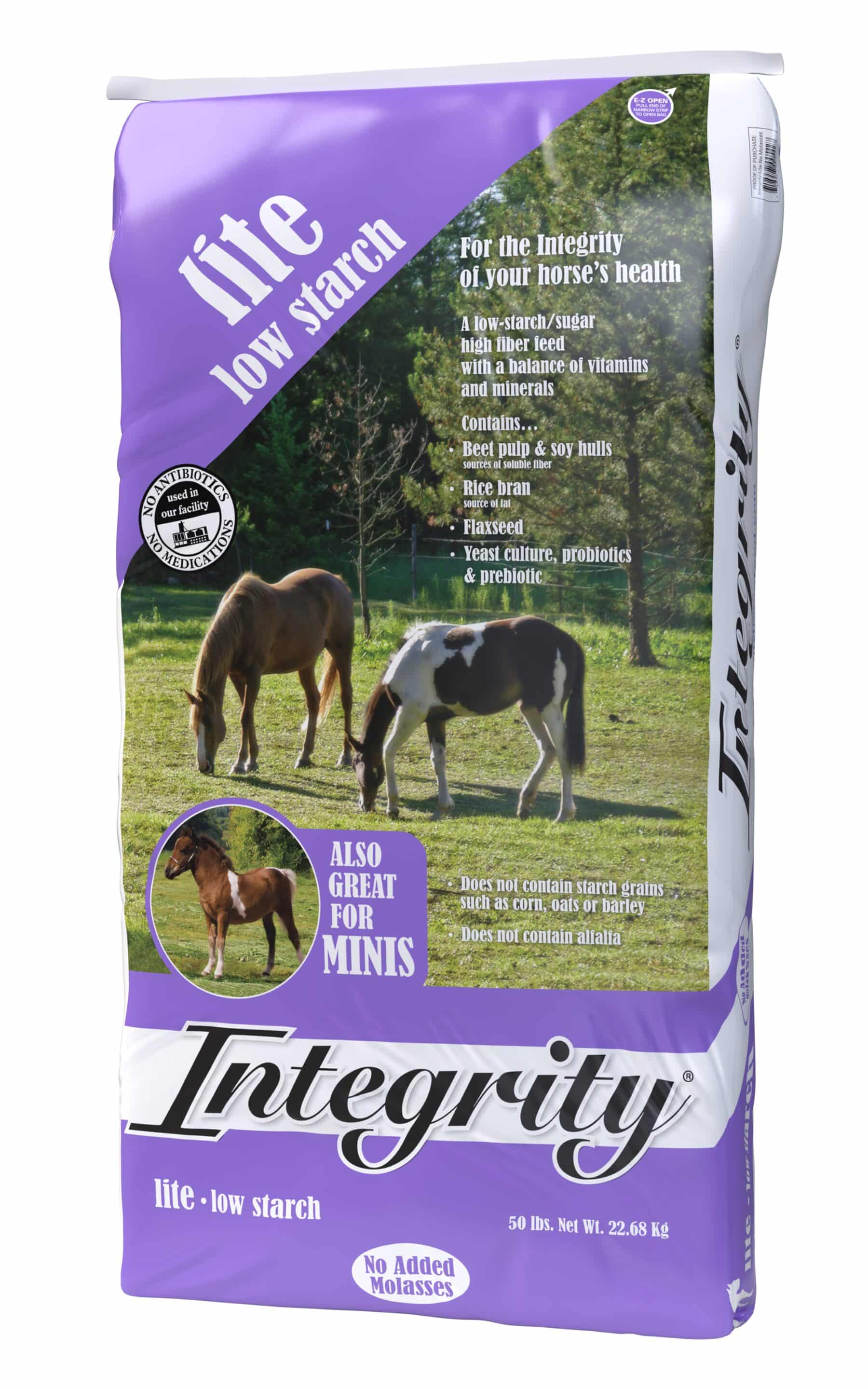 Soluble fiber feed ingredients are an important attribute of the Integrity product line. Integrity Lite is the ideal feed for minis, companion, senior, laid-up, easy keepers, and overweight horses. Horses with conditions requiring a low starch diet may also benefit from this diet (consult with your veterinarian before making feed changes).